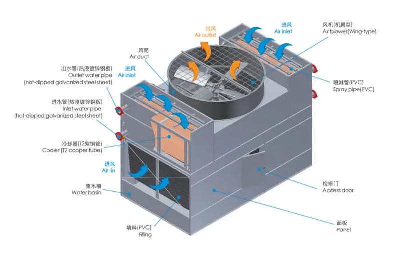 WBF-DS閉式復(fù)合流冷卻塔采用雙冷卻管束,兩側(cè)進(jìn)風(fēng)設(shè)計(jì),進(jìn)風(fēng)更高效,冷凝器更穩(wěn)定。風(fēng)機(jī)和水泵均采用優(yōu)質(zhì)軸承,除此無其他磨損部件。以及運(yùn)用了風(fēng)水同向橫流式二次熱交換的管束與PVC填料組合的技術(shù),實(shí)現(xiàn)了高效換熱。